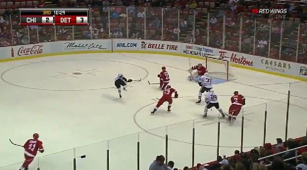 Detroit 3 Chi 3; 9:33 in 3rd period- Pirri from Hayes