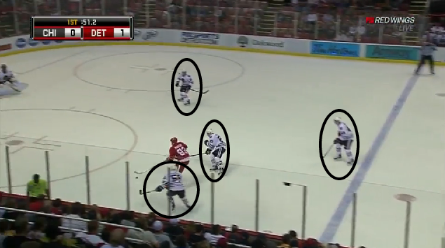 Filppula uses a spinning backhand pass to get the puck to Franzen, who's entering the offensive zone with speed along the left side. Two strides into the zone he's created an irreversible amount of separation between himself and four Chicago defenders.